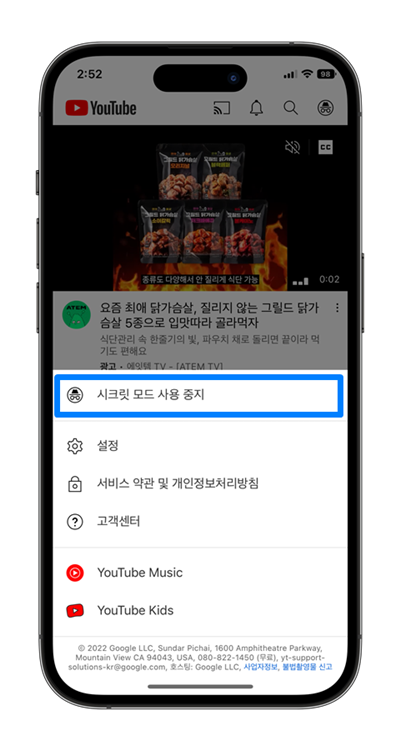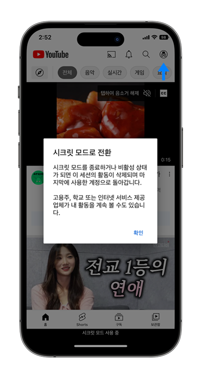 시크릿 모드에 대한 안내 문구와 함께 프로필 사진이 시크릿 모드 아이콘으로 변한 것을 확인할 수 있습니다. 이제부터 시청하는 영상은 시청 기록이 남지 않으며, 유튜브 알고리즘에도 영향을 주지 않습니다.