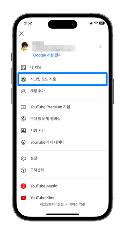 구글 계정 관리 화면이 나오면, 메뉴 중에서 [시크릿 모드 사용]을 탭 하시면 됩니다.
