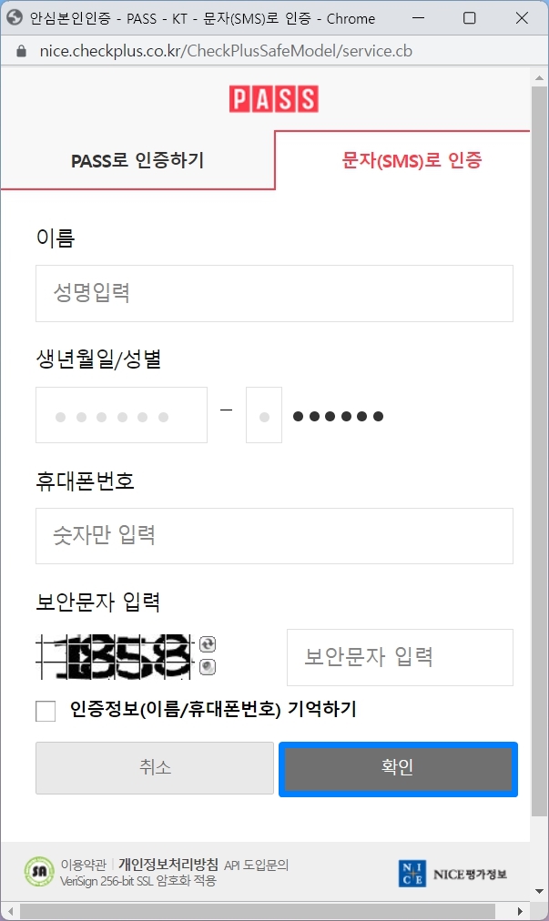 - 이름, 생년월일, 휴대폰 번호와 보안 문자를 입력하고 [확인] 버튼을 누릅니다.