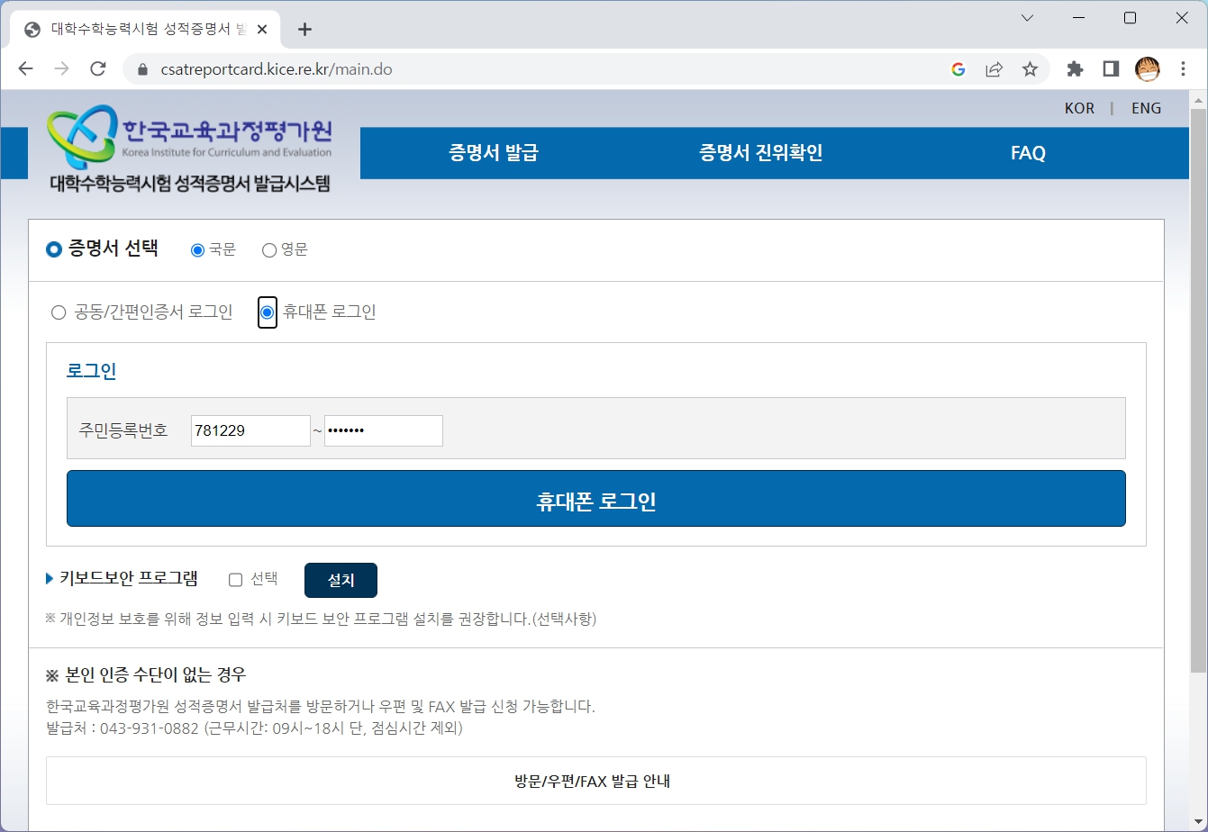 이제 막 수능을 본 수험생의 경우 위의 인증서가 없을 가능성이 높겠죠? 이 경우에는 휴대폰 로그인을 이용하시면 됩니다.